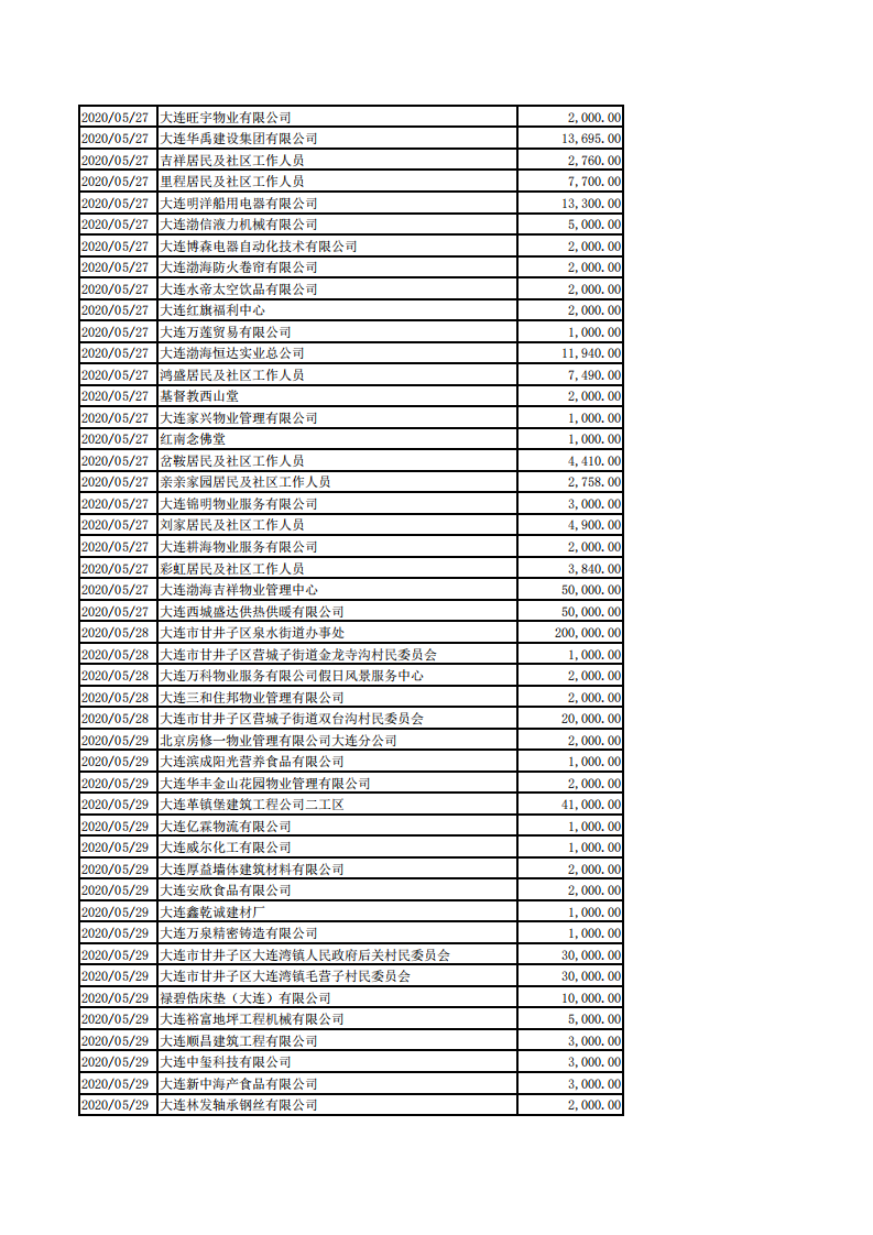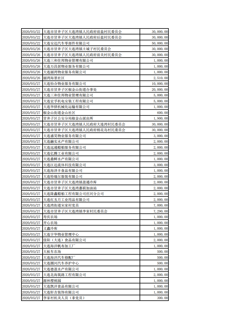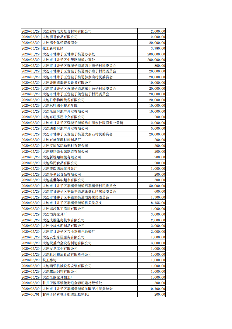 甘井子区慈善总会2020年1月1日-8月31日捐款情况