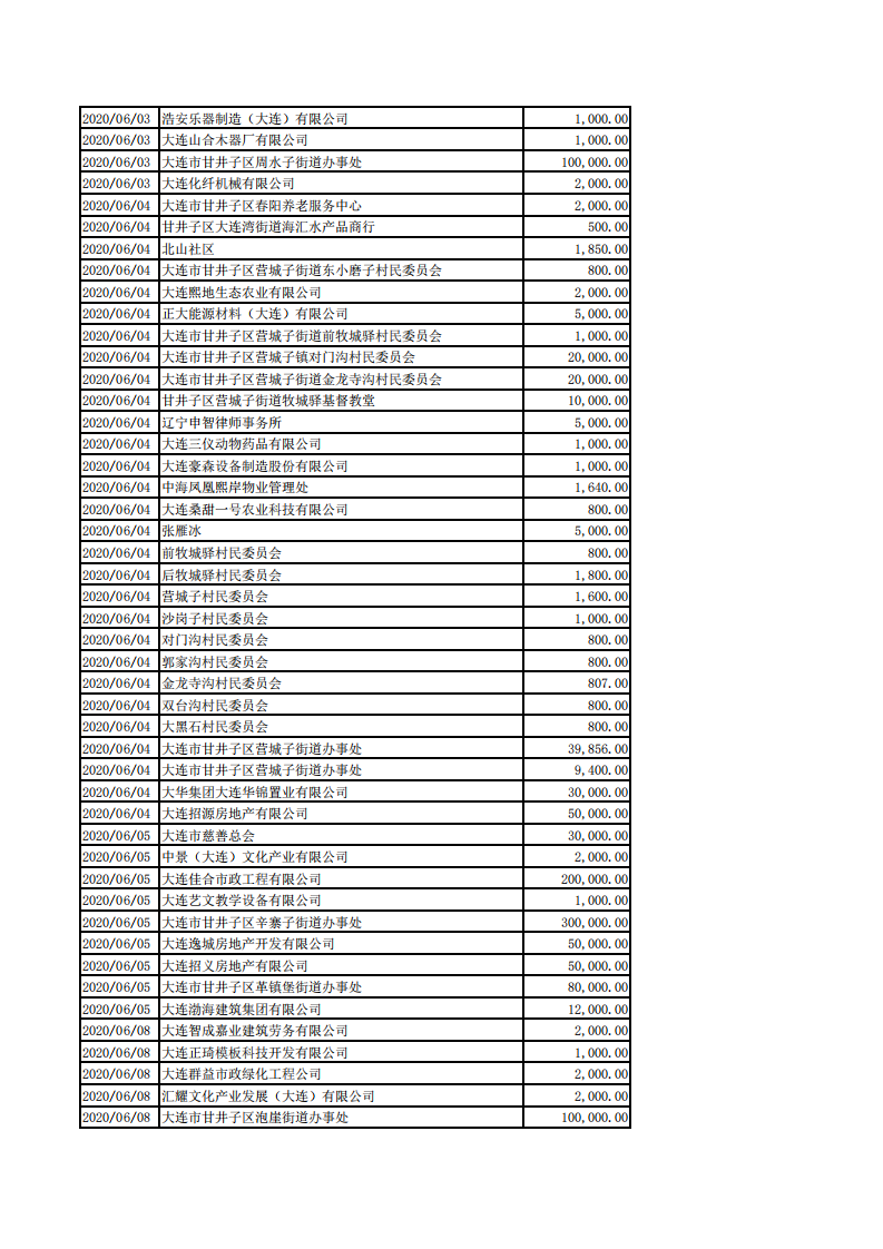 甘井子区慈善总会2020年1月-8月捐款情况